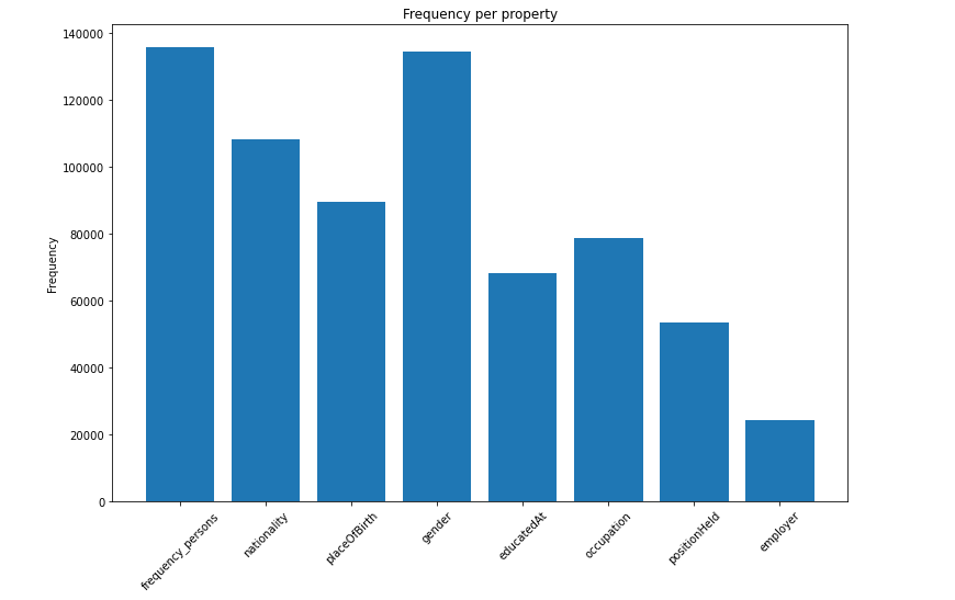 Cette visualisation nous renseigne que c'est la propriété “genre” qui est la plus renseignée, sans doute, car c'est l'une des plus simples à obtenir. On peut remarquer aussi que la propriété “profession” est peu utilisée alors que c'est par cette même propriété que nous avons définie notre population. Mais cela s'explique, car ce sont seulement ceux avec une étiquette en anglais qui sortent.