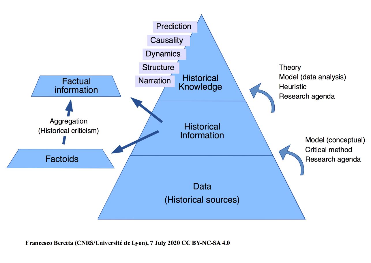 Dans cette perspective, les données de la pyramide de la connaissance, les data, ne sont pas les données numériques mais, d'une manière générale, elles incluent toutes sortes de sources historiques (documents manuscrits ou imprimés, artefacts, sites archéologiques, tradition orale, peintures, enregistrement sonores, images numériques, etc.). Il s'agit de la masse pour ainsi dire 'informe' des matériaux qui sont à disposition dans le bibliothèques, archives, musées, etc.