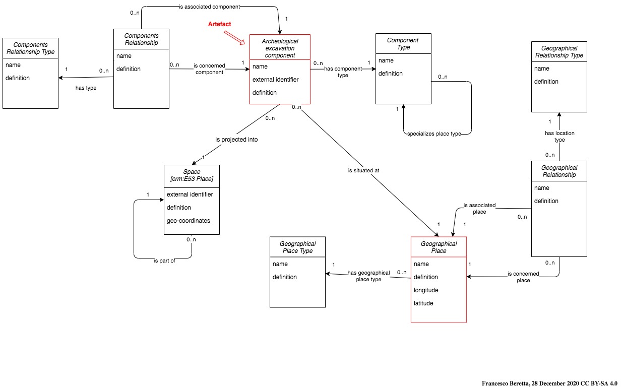 Chaque composante de la fouille est située par rapport aux autre composantes par la classe Components Relationship qui décrit la position relative des objets grâce à une typologie adéquate (par ex. couche supérieure pour une unité stratigraphique, ou se situant dans cette direction pour un mur par rapport à une couche, ou se trouvant dans la couche pour un objet lithique, etc). L’objet situé est associé par la propriété is concerned component tandis que l’objet par rapport auquel le précédent se situe est associé par la propriété is associated component. Les cardinalités 0,n : 1 indiquent que seulement deux objets peuvent être associés avec une relation.